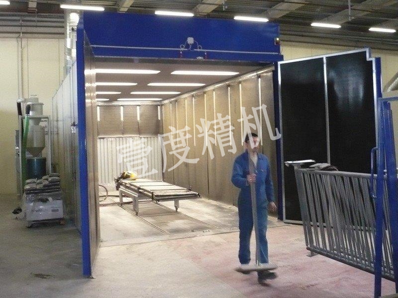簡易噴砂房工作原理:是指采用壓入式噴丸原理,把丸料(鋼丸、鋼砂、剛玉或玻璃珠)以很高的速度和一定的角度噴射到工作表面上,讓丸料沖擊工作表面,達到清理目的。工件可通過人工搬入噴砂房內部,也可以通過臺車運載自動進入噴砂房內部,在噴砂房內部可固定不動,也可升降吊起,或進行旋轉等配合噴丸清理。需人工佩戴防護器具,進入噴砂房內手持噴槍對工件加工,噴出的丸料散落在噴砂房體地面上,需人工清掃回收,再將磨料倒回加壓罐內循環使用。簡易噴砂房主要是指磨料為人工回收方式,噴丸清理為人工操作。